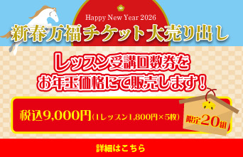 ☆新春万福チケット大売り出し☆ レッスン受講回数券をお年玉価格にて販売いたします! 限定20組!!となりますのでお早めに!! 金額 9,00 ...